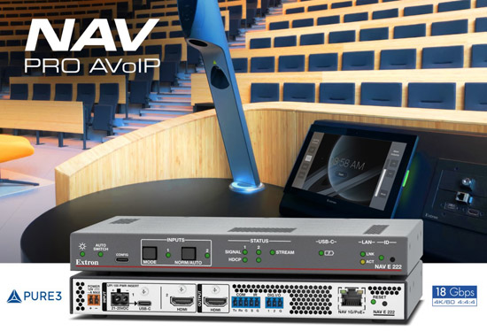 NAV E 222 是 Extron 全新推出的一款双路输入切换编码器。它为我们屡获殊荣的 NAV® Pro AVoIP 系列平台增添了 USB-C 和 HDMI 输入信号切换功能,让广大 AV 系统设计师能够更加灵活、高效地设计部署高性能的流传输解决方案。