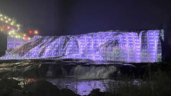 硬核防护并行: 施工采用模块化分组作业,并为投影机集成IP65防护箱、冷却及防雷系统,确保在临水、高空环境下的稳定性与施工效率