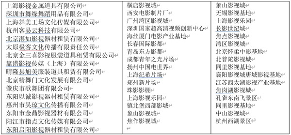影视基地:横店影视城、西安电影制片厂、广州湾区影视城、深圳国家超高清视频创新中心、海丝厦门电影产业基地、长春国际影都、青岛东方影都、成都青年之光片场、扬州中国电世界、上海纪希片场、郑州新片场、珠影影棚、上海影视乐园、镇北堡西部影城、象山影视城、焦作影视城