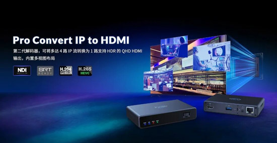 美乐威Pro Convert系列产品无缝连接传统音视频信号与IP流,支持众多格式和不同协议的网络流,包括NDI® High BandwidthNDI® HX2NDI® HX3H.264/H.265以及 SRTRTMPRTSPHLSMPEG-TS等协议。此次推出的Pro Convert IP to HDMI解码器作为该系列的升级产品,在继承原有型号灵活可靠性的同时,解码性能更强大、输入路数更多、采用通用尺寸设计,并优化了Web GUI。除已兼容的多种格式外,该新产品可直接解码Zixi流,进一步拓展对不同类型工作流的支持。