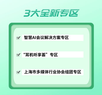 此外,展会还拓展了新兴垂直细分市场,设立3大全新专区——智慧AI会议解决方案专区(1.2馆内)、“耳机听享荟”专区(2.2号馆)、上海市多媒体行业协会组团专区,为行业发展注入新活力。