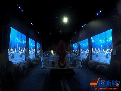 十余台科视投影机、7thSense无损播放器、Scalable异形自动校正系统,成就了沉浸感无缝全景影像,浩大而清晰,自观众面前延至身后。由Alcorn表演控制系统将影像与立体声环音,同步协调,使观众置身其间,临场效果十分强烈。