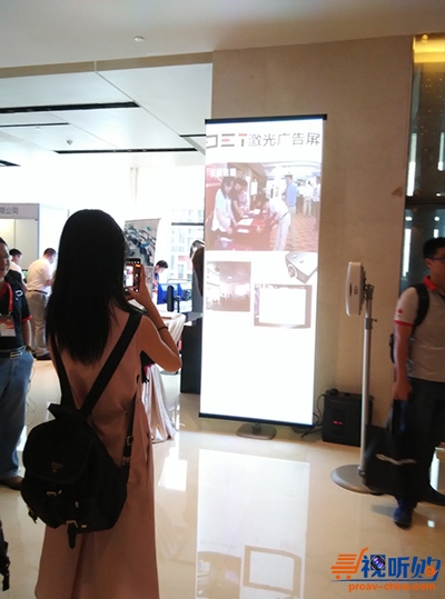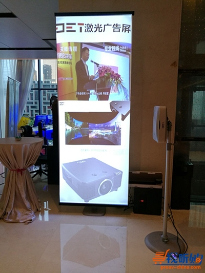 DET德浩还带来了超宽屏超短焦激光商务投影机的解决方案——DET-V1视频易拉宝移动广告看板,采用1.12*2米的易拉宝与DET-V1的组合。DET-V1具有0.25超短焦镜头,分辨率为1920*720,亮度高达3200流明,并充分利用其支持侧立投影的特性,经过简单的制作,可达到一个屏播放多个画面的效果。现场也可见,经由V1播放出来的画面效果十分惊艳,吸引了不少停留驻足的参观者。