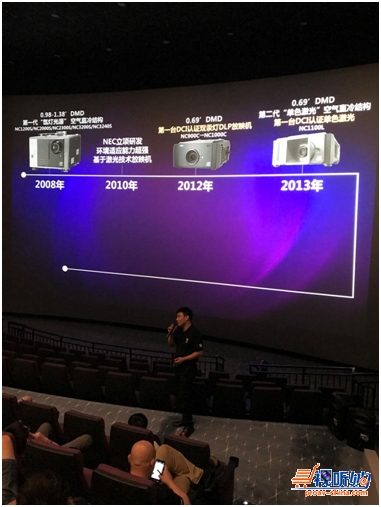 此次巡展主要展出了两款产品,单色激光电影机NC1201L+和双色激光电影机NC3541L+。其中,NC3541L+是今年NEC的主推产品,适用于大型影厅,播放帧率可达120Hz,动态画面更为流畅、逼真。两款产品均采用NEC激光数字电影机独有的双腔体防尘结构和CCT内循环冷却专利技术,防尘、散热效果佳,有利于提高电影放映机的使用寿命,大幅度降低影院的维护成本。