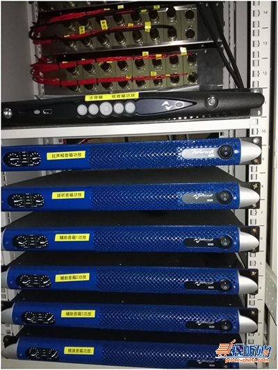 功放系统选择Powersoft X4 DSP+dante推动两只主扩音箱安装到设备室机柜、多只Powersoft M30D推动其它音箱安装到设备室机柜。