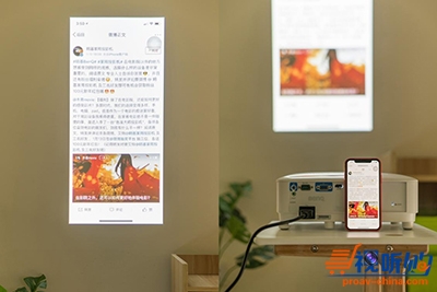 就在我对这台投影机赞不绝口的时候,小陆拿出了手机,轻轻一点,手机的画面就投到了屏幕上,这简直打破了我对投影机的认知。