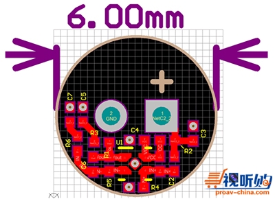 图 3:安装6mm直径驻极体麦克风背面的麦克风前置放大器布局