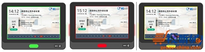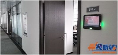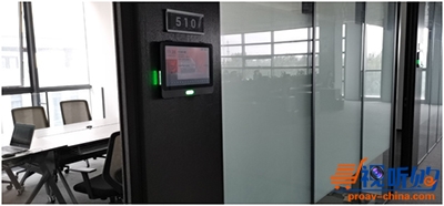 现在,每间会议室门口都壁挂10英寸智能会议室门牌,实时呈现使用状态——开会时显示红色、空闲时显示绿色、有人临时进入显示黄色;并且,屏幕还显示当天所有会议日程,方便查询。