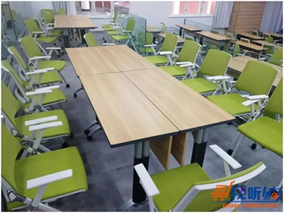 传统阶梯教室桌椅固定,学生分组困难,小组讨论阶梯教室打破一阶一排格局,将两层阶梯合并为一层,学生们既可以分成两排听课,也可合并成大桌进行小组讨论,还可通过newline会议平板辅助学习。
