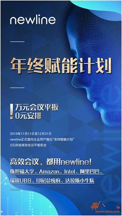 当下,“智能协同办公”理念深入人心,newline贴近终端用户,完善服务体系,迎合市场所需;2019年11月-12月,newline为广大中国用户带来震撼的“年度盛宴”,机不可失,赶紧来参加“0元试用”,即刻拥有高效率协作沟通会议室!