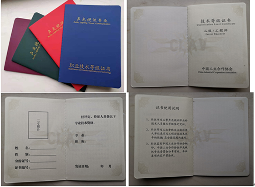 经培训理论考试、实操考试合格,论文答辩(二级)通过,由中国工业合作协会声光视讯专业委员会颁发“声光视讯专业”职业技术等级证书,北京经贸职业技能培训学校颁发结业证书。