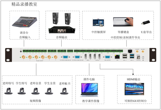 本项目是为满足校方展示传播优质课堂教学需求而建设,项目包含一间精品互动教室,实现统一控制管理、音视频调度等应用。