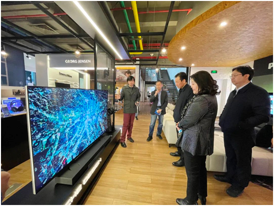 此外,一行领导在冠捷集团总裁特别助理丁紫惠等负责人的陪同下,共同参观冠捷全屏展示大厅。展厅通过应用场景、图片、视频等形式,生动全面展示了冠捷科技集团旗下的智慧商显、显示器、电视、音视频等全品类视讯产品,让一行领导切实感受到冠捷科技集团高标准的视讯服务及更具针对性、定向性、专业性的全品类视讯生态体系。