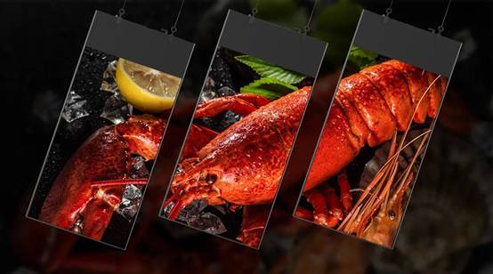 超薄高亮双面屏还能双屏呈现不同的内容,例如朝外的A面可呈现相关促销信息,朝内的B面则能展示门店品牌背景、经营理念等信息,根据不同的消费人群做到不同内容的多元化、个性化、定制化展示。此外,通过视频、滚播海报、动态模板等动态化内容形式的展示,也能将店内的美食佳肴呈现得淋漓尽致,强化美食对消费者的视觉吸引力,全面提升消费者的消费体验。