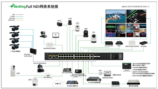 除了B Live-ESPN高空直播,BirdDog全系列Full NDI产品还用于全球很多类型的案例中,比如户外拍摄、会议、演播室、电竞、体育等等,(BirdDog系统图)随时都能提供一套高性价比的组合搭配,包括室内/户外用云台摄像机、4K/高清编解码器、多种软件。
