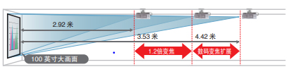 松下PT-LMZ460C系列投影机通过数码变焦扩展功能和数码图像移位功能实现轻松调试。当投影距离超出投影机光学变焦范围时,可通过全新搭载的数码变焦扩展功能扩展投影距离。如投影100寸画面时,可由光学变焦的3.53米投影距离扩展至4.42米。使用数码图像移位功能时,投影图像大小缩减至80%,同时实现上下、 左右±10%的位移幅度。在不移动投影机的情况下,即可将图像移动到想要的位置。