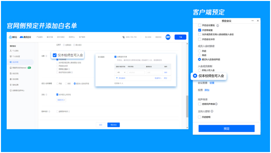 腾讯会议教育版支持学校进行账号统一管理及维护,预定课程时,可设置“仅限学校教师及学生”用户入会,确保学生不会串堂。