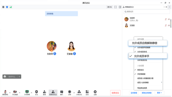 为了避免学生误开麦克风,老师通过腾讯会议界面,可以控制学生的音视频权限,一键全体静音,解除特定成员静音,或关闭特定学生的视频。