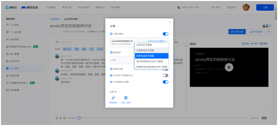 腾讯会议教育版支持课件或课堂作业上传,供学生课后复习;同时为保障教学内容安全,可对成员的屏幕共享、聊天、上传文档、应用分享进行权限管理。