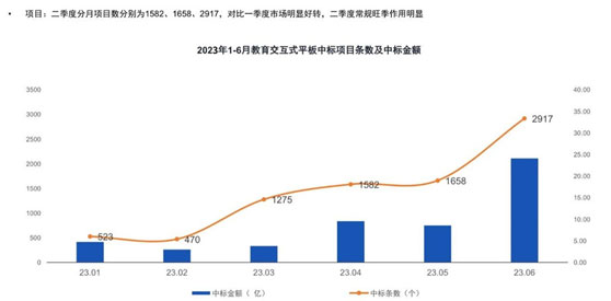 教育交互式平板作为教育学习终端产品,市场前景可观。根据奥维睿沃《中国大陆IWB市场季度研究报告》数据公布,2023年第二季度教育交互式平板市场常态化回归,中标项目和中标金额均上升。教育交互平板市场保持常态化发展。