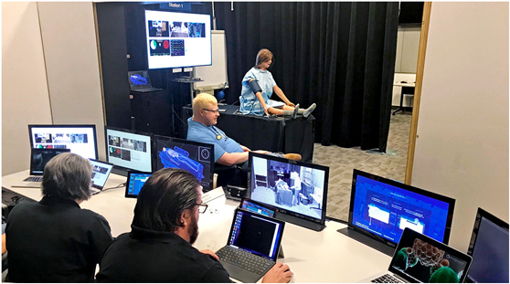 当教师选择从控制间设定场景模式,则由工作站的操作员接管设备。教师通过桌面麦克风,无线领夹式麦克风或耳麦与实验室内戴耳麦的同学进行交流。控制室和实验室之间的双向通信通常可使用各工作站人员配备的一键通麦克风,以及与各病床对接的天花板麦克风和扬声器来实现。无论采用何种方式,所有的通信都将被记录,以便于流传输及存档。