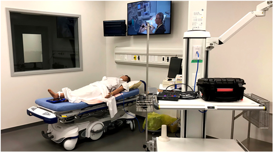 病床周边配备 1 到 4 台 PTZ 摄像机,Shure® 无线麦克风系统,天花板扬声器和 Sharp® 50" 墙面显示器。床上方的 PTZ 摄像机可采集现场画面用于流传输/存档,并为控制室操作员进行监控及交互式通信提供便利。特定病床工作站的铰接臂加装 24" 显示器,两路 HDMI 输入端自天花板垂下,另有至少带 1 路 HDMI 输入的墙面板及一路内置于手术灯具的定焦摄像机。部分演示工作站还配备多普勒超声或肾透析机等专用医疗设备。