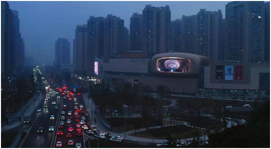 在建筑另一侧高处嵌入一块高清裸眼3D 大屏被称为“天新之眼”,这块超大户外LED 每日曝光量超20万辆车次,广告价值显而易见。一座宇宙飞船从“天新之眼”中驶出绕回,打造漂浮科幻、极具未来感的沉浸式感官体验。