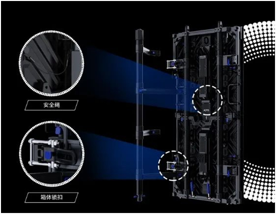 产品配置风阻架,可有效抵御八级大风,加上高户外防护等级,使其能够轻松适应各种复杂的环境。箱体锁扣在产品设计上实现更粗壮,可牢牢锁定箱体之间的连接点。模组配备安全绳索设计,使其不会轻易地掉落,为现场的舞台演出、大型活动保驾护航。