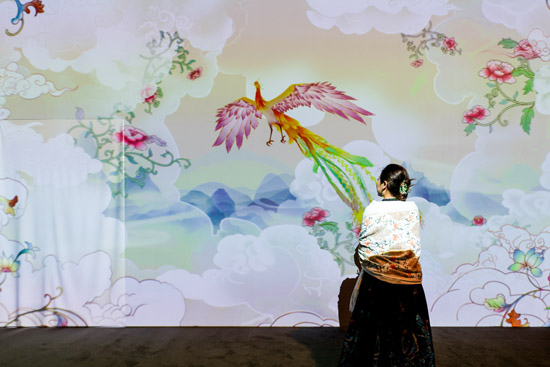 展厅布置了层层丝绸缎带,10台巴可I600-4K15将光影精准地投射在不同介质上,演绎“衣冠上国”的华彩。观者漫步其间可触发鲜花绽放、蝴蝶与仙鹤伴飞的景象,解构织锦文物的经纬之美。