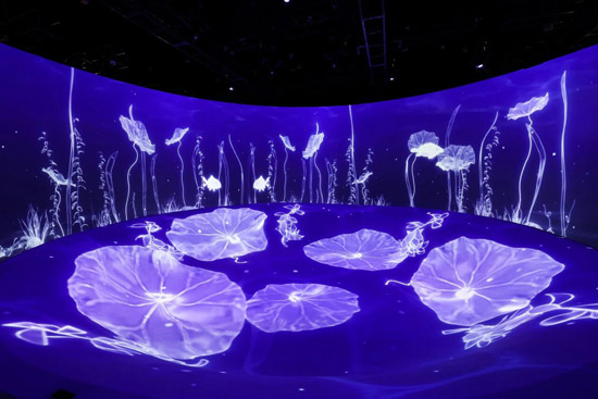 整个空间由四周的墙面环幕和中央的巨大“影碗”造型构成,共应用16台巴可I600-4K15。其中4台投影机吊顶垂直投射至“影碗”中,演绎五朵荷花盛开的互动景象,异形曲面光影均匀;墙面环幕则投影着600余件国宝瓷器纹样联动的震撼效果,随着游客指尖轻触,文物纹样即刻“活”于眼前。