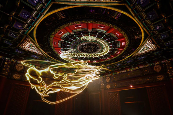 大至星辰祥云,小至花鸟草木,10台巴可I600-4K15构建了一个奇幻瑰丽的沉浸空间,观众仿佛置身于紫禁城流光溢彩的纹样河流之中,脚踏七星召唤神龙。